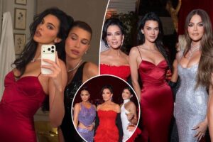 Kylie Jenner showed off her holiday spirit in a curve-hugging red leather jacket. The “Kardashians” star was pictured modeling the cropped plunging jacket in fire-engine red while standing in front of a white Christmas tree with a sultry expression. She…