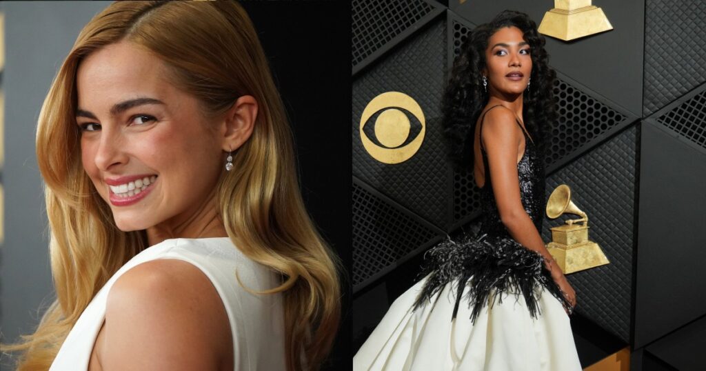 British girl group Flo, a first-time nominee, paid homage to Destiny’s Child with their matching sets. Jorja Douglas, Stella Quaresma and Renee Downer each wore coordinated beaded black and royal blue ensembles from Luar. Destiny’s Child famously wore matching green lace cut-out looks at the 2001 Grammys where the group won two awards.
