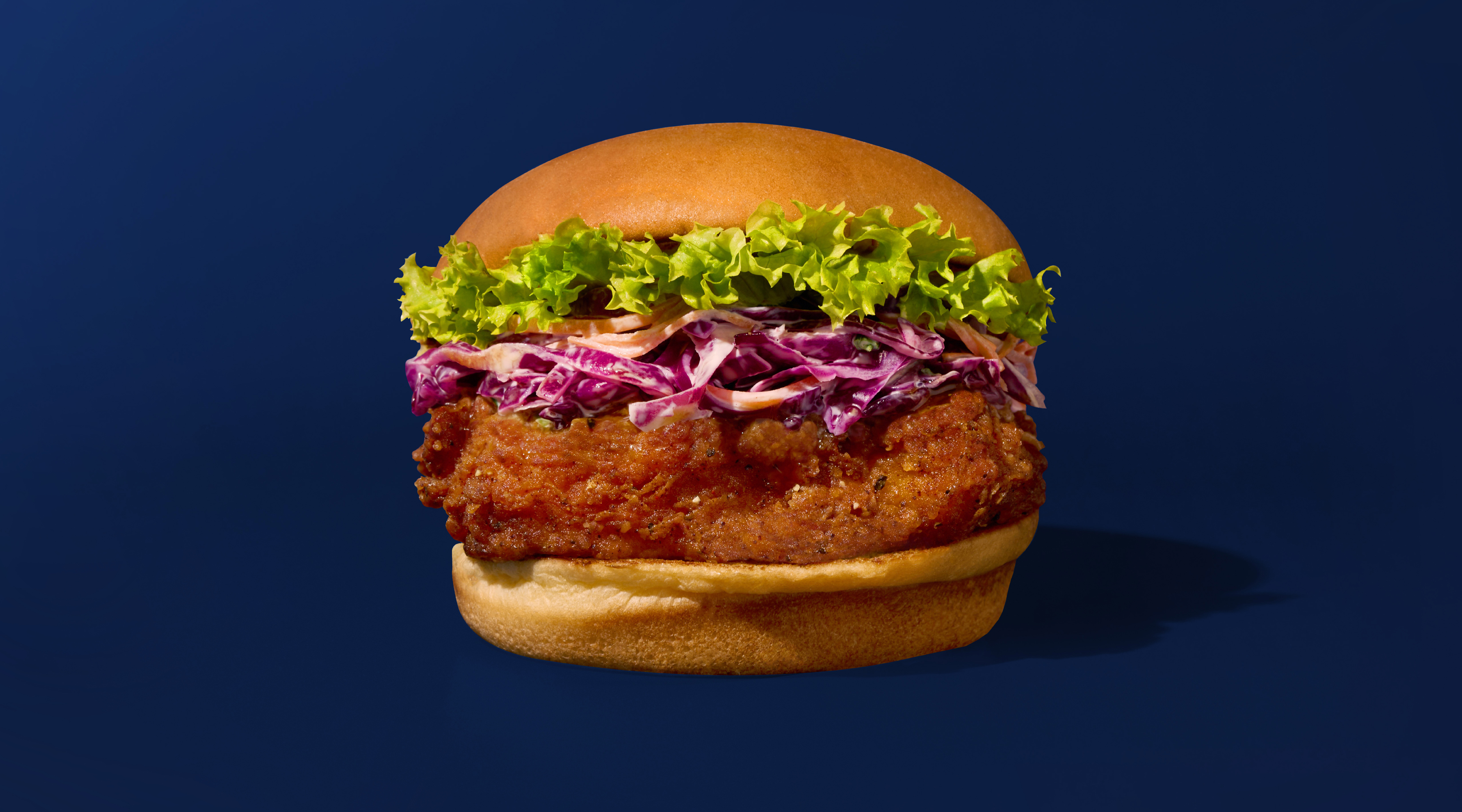 Hand-breaded chicken breast or thigh is covered in a Huli Huli sauce and topped with coleslaw and lettuce, served on a toasted potato bun.