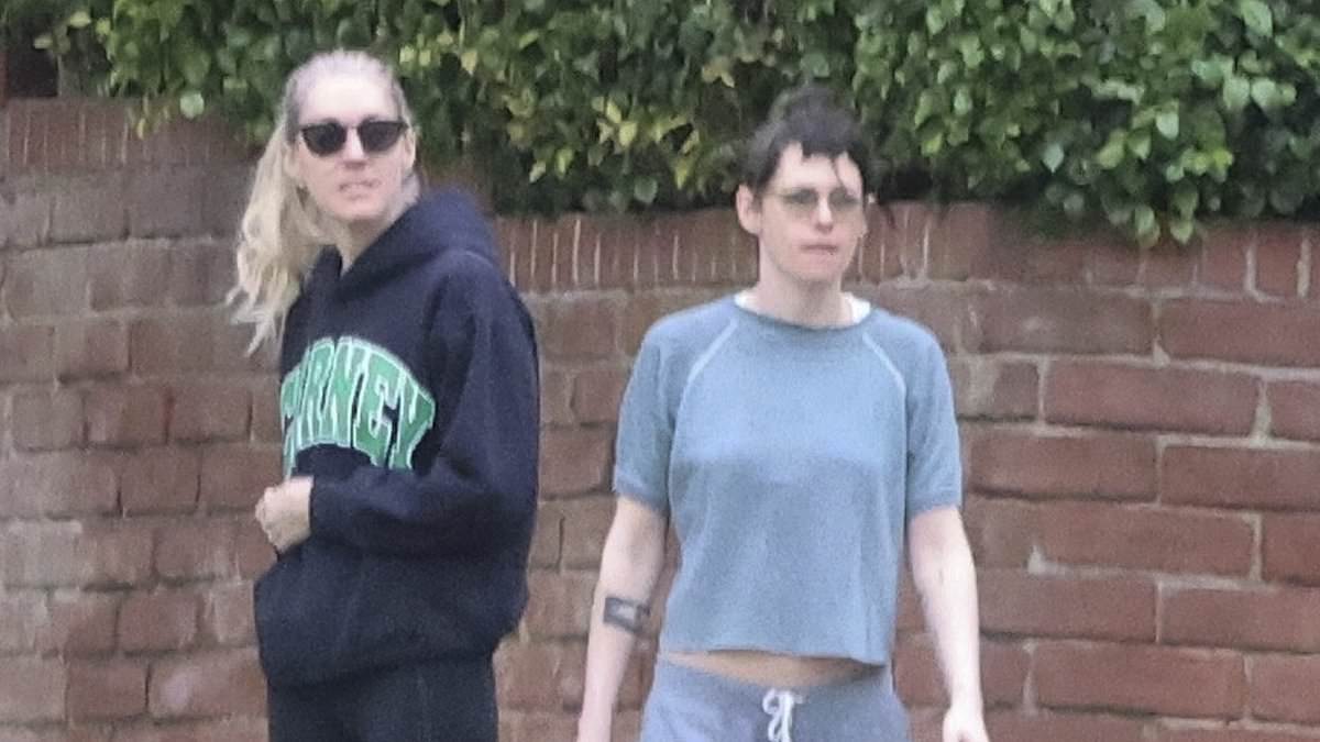 Kristen Stewart (R) and her wife Dylan Meyer (L) sported sweats while walking their canine companion Cole not far from her $2.195M four-bedroom Los Feliz home in LA on Tuesday