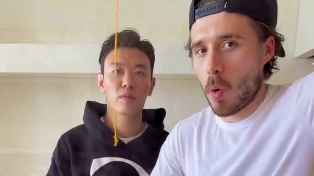 After showing off his chopping skills to his impressed-looking friend Zach, Brooklyn mixed up a batch of spicy sauce with his Cloud 23 brand and vodka and then tipped some pasta into boiling water.