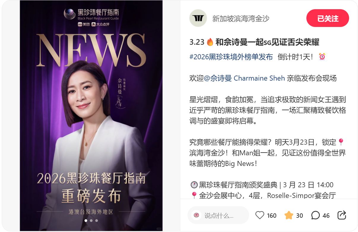According to a Xiaohongshu post by Marina Bay Sands, Charmaine will be attending the 2026 Black Pearl Restaurant Guide Award Ceremony held at the integrated resort today (March 23).