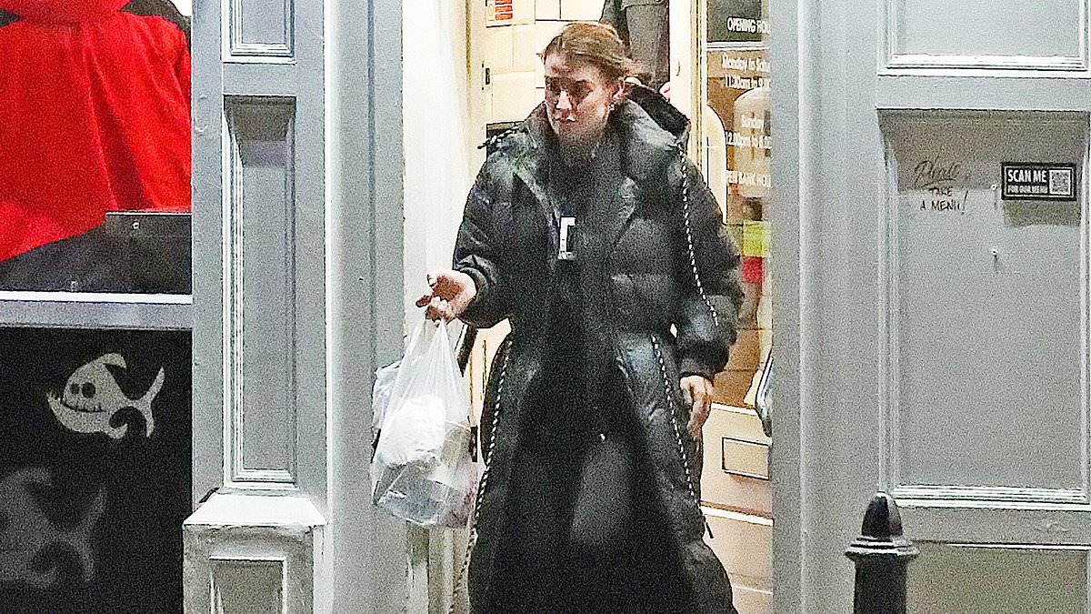 The I’m A Celebrity star, 39, teamed black leggings and a matching jumper with her longline padded coat as she exited Fosters Fish & Chips shop with a takeaway for the Rooney household