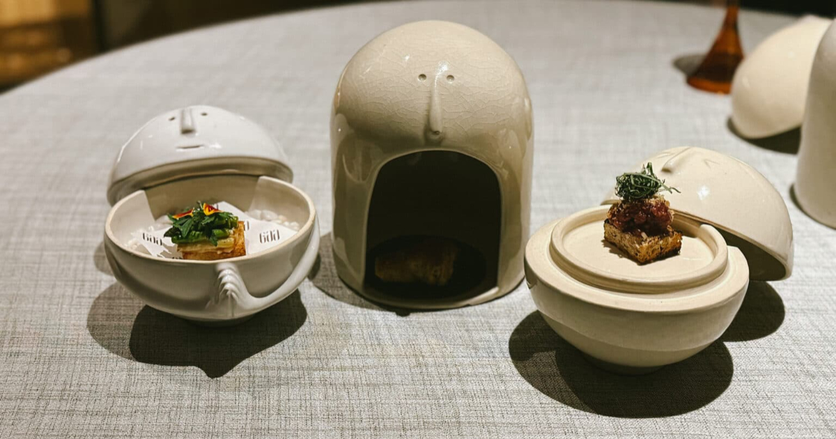 The tableware also played an important role in shaping the experience. Many pieces felt almost sculptural, with organic forms that echoed the curved lines of the dining room itself. Eating from these vessels naturally slowed the pace of the meal, encouraging a more tactile engagement with each dish.