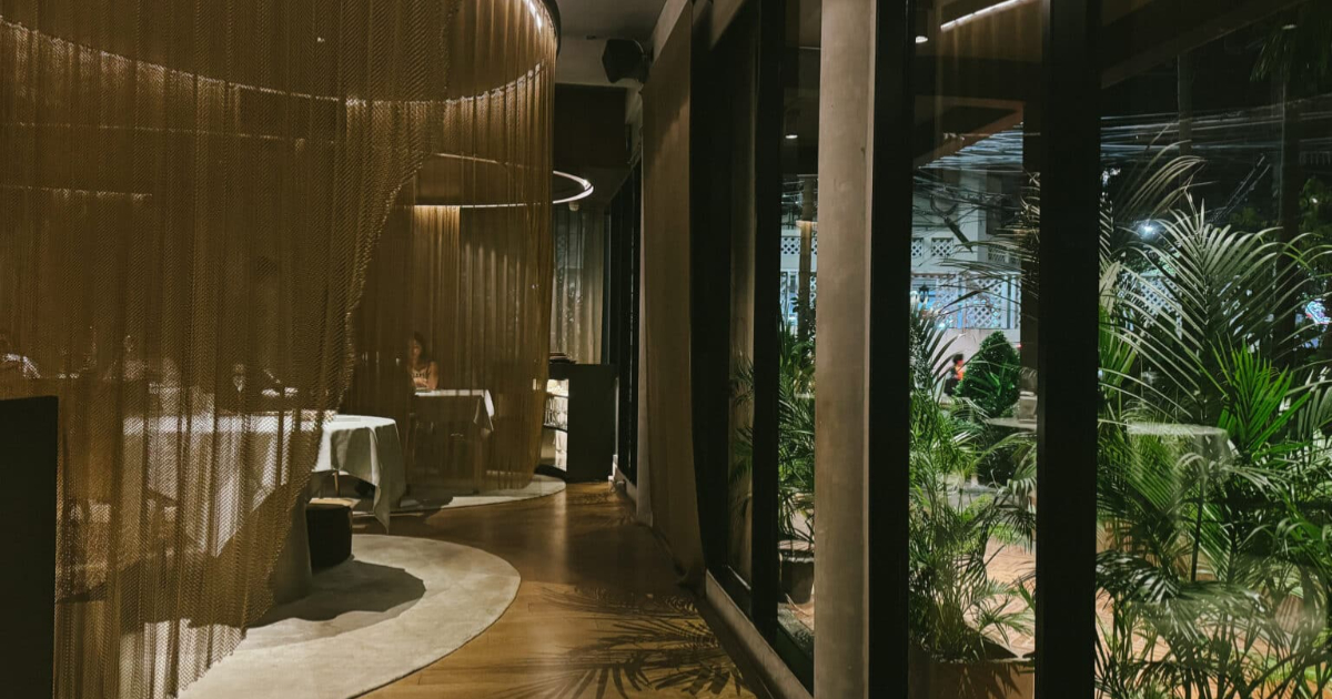 The dining room felt immediately more intimate. Tables sit within softly defined cocoon-like spaces formed by sheer metal chain curtains. They provide privacy without completely separating diners from the rest of the room.