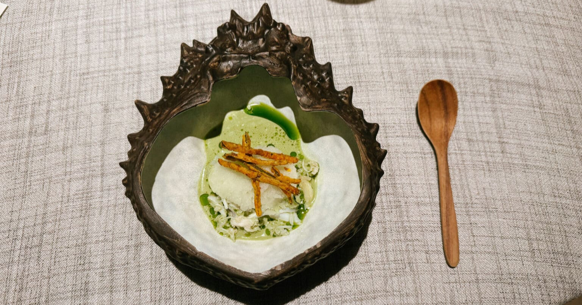 Another memorable course was the Summer Curry, think blue swimmer crab with grilled banana leaves, coconut, and green apple ice. The dish arrived fun and refreshing, with shaved ice lending it a cooling quality that made the flavours feel bright and playful.