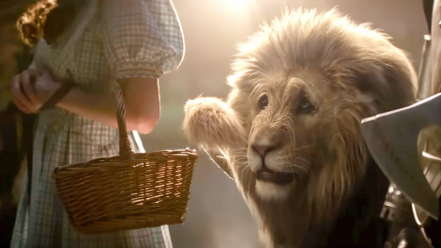 Dorothy — played by Judy Garland in 1939’s The Wizard of Oz — arrives in Oz just as she does in the original film, when her Kansas home lands on the Wicked Witch of the East, and Elphaba’s sister, Nessarose (Marissa Bode). Viewers only see Dorothy from behind — a vantage point that continues throughout the film — as she steps onto the yellow brick road to retrieve the Wicked Witch’s broom from the Wizard, along with the Scarecrow (Jonathan Bailey), Tin Man (Ethan Slater) and Cowardly Lion (voiced by Colman Domingo).