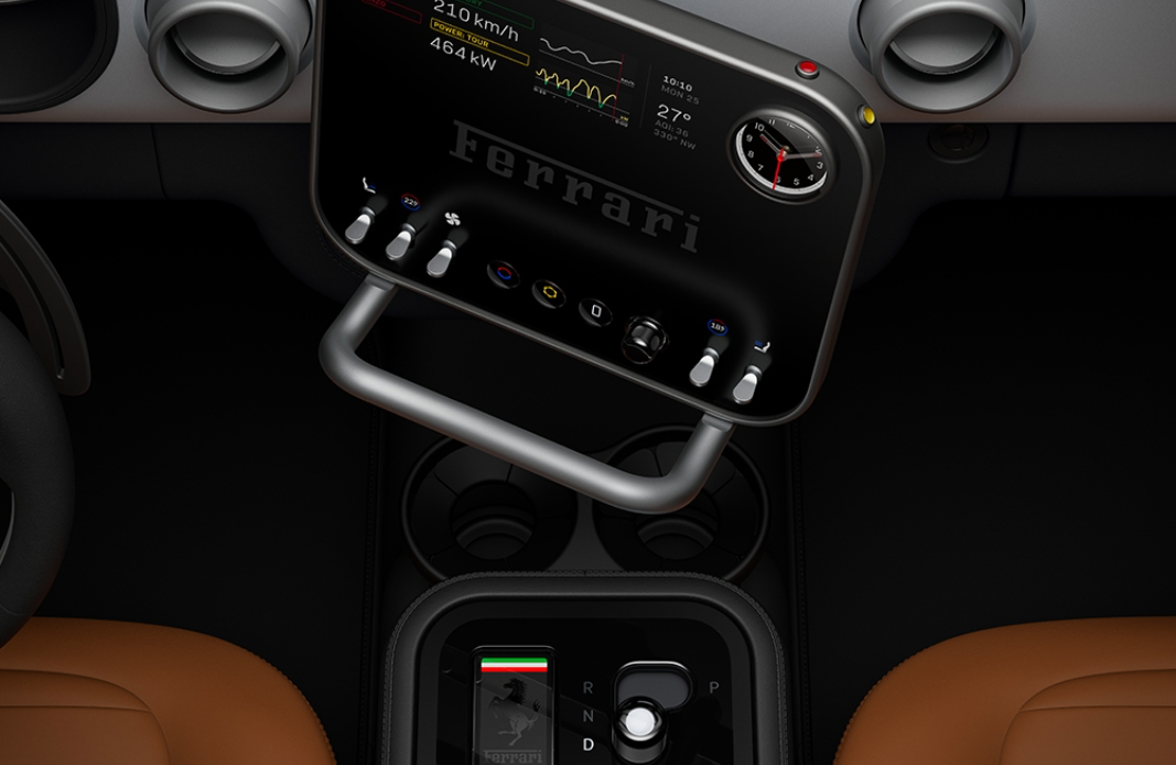 It also features three displays: The driver binnacle, control panel, and rear control panel. The binnacle is an instrument cluster mounted on the steering column, a first for a range Ferrari. It features an ultra-light and ultra-thin OLED panel, as well as a world first – three large cutouts strategically reveal the information generated by a second display behind the top panel.