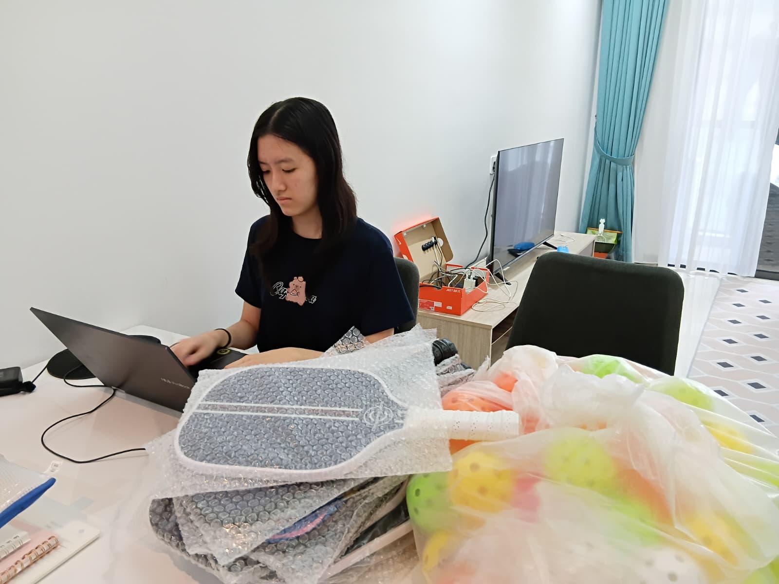 The pickleball paddles are stored in a temporary storage space shared with another business. Most of the stock is kept in Malaysia, but the items are shipped to Singapore regularly.