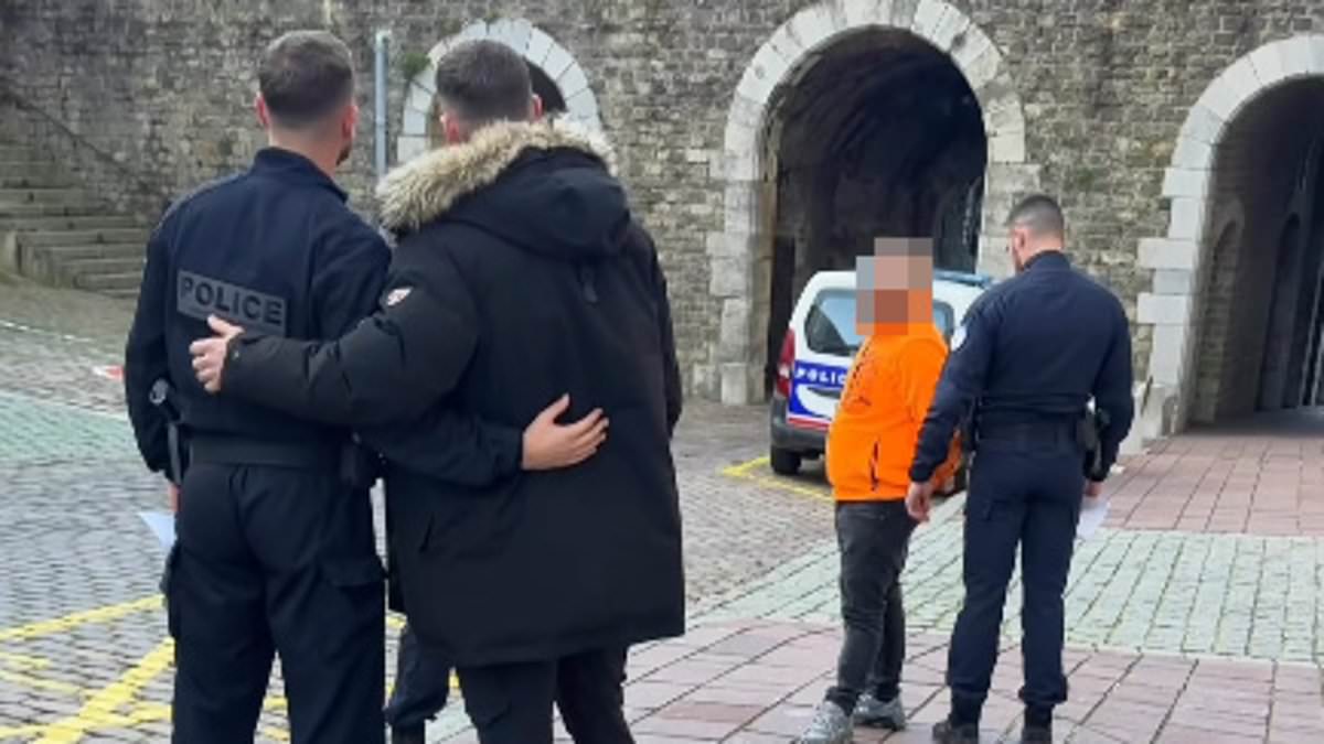 As Matt, 40, poses with his fan, a man wearing a bright orange jacket can be seen in handcuffs just feet away, watching on