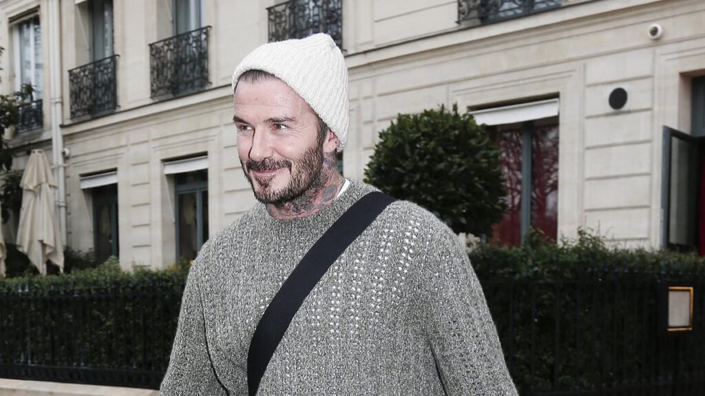 David meanwhile cut a more casual figure while out with Romeo and Kim and wore a grey jumper and warm hat