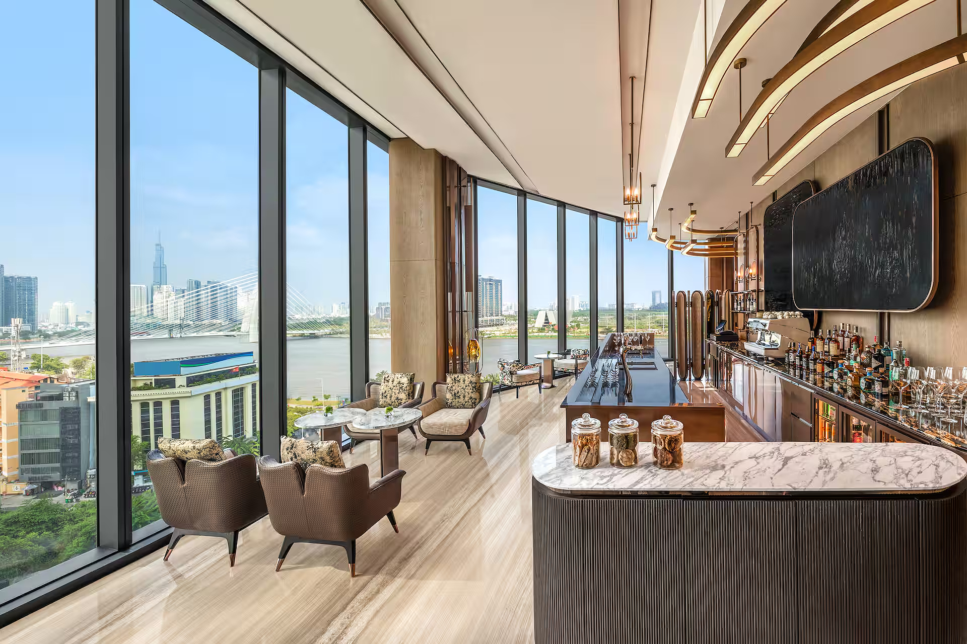 Reception sits on the ninth floor, opening immediately to a wide, sunlit view of the Saigon River.