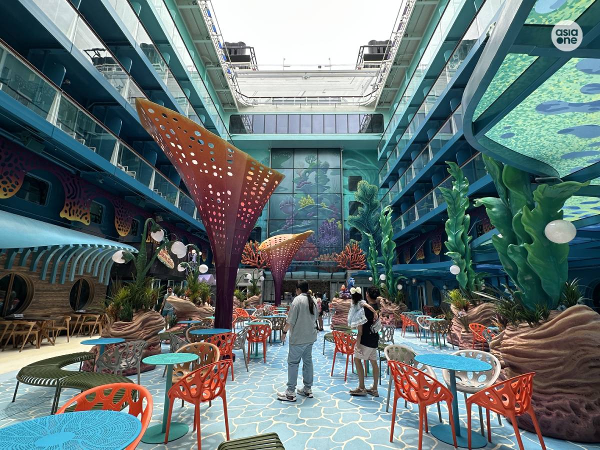 Located at the back of the ship, the open-air retreat features glass canopies that let sunlight stream in, creating a dreamy atmosphere. Coral reef-like structures add to the illusion of being under the sea
