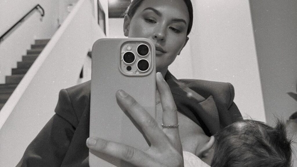 The glamorous model, 34, posted a photo of her tenderly cradling her bub as they relaxed at home.