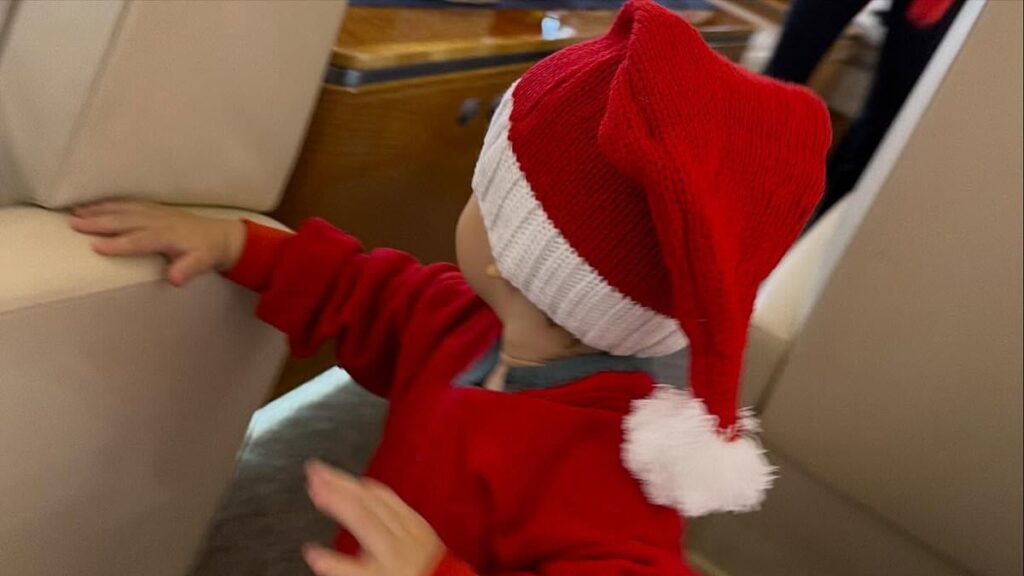 Little Jack could be seen wearing a themed red sweater with a Santa hat as he scampered along a private jet headed to an unknown destination.