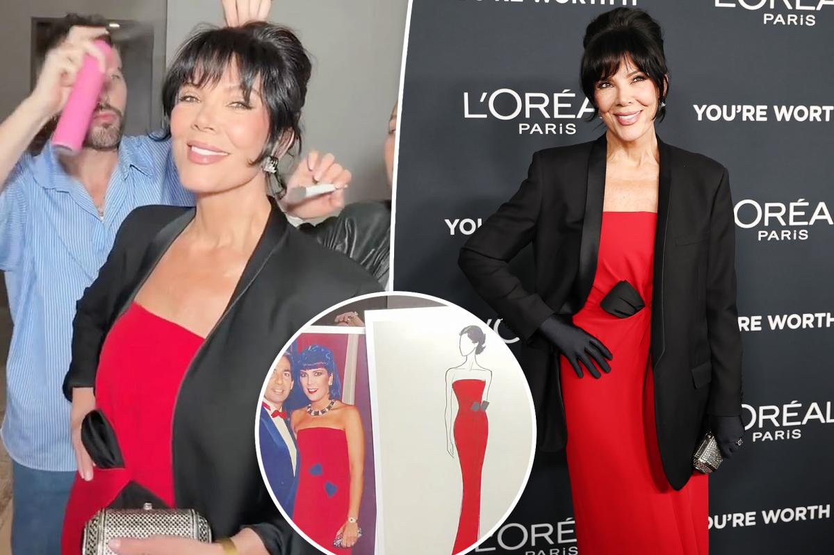 The original sketch of the dress is pictured alongside an ’80s-era photograph of Kris wearing the look alongside her late ex-husband, Robert Kardashian. The oversized images part to reveal Kris in the present, wearing an identical gown.