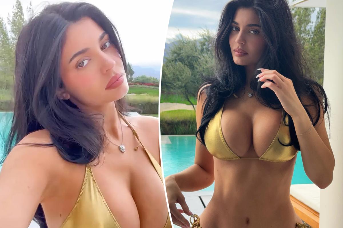 Sharing a series of photos poolside, Jenner posed in front of the camera wearing a metallic Lisa Marie Fernandez bikini and some major jewels.