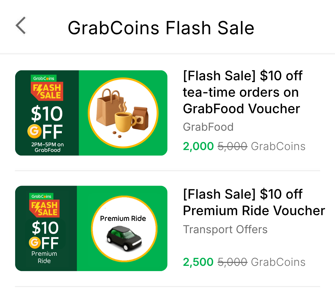 | One x $10 off Grab premium ride vouchers (to treat myself) at 50 per cent off | 2,500 GrabCoins (usual value: 5,000 GrabCoins) |