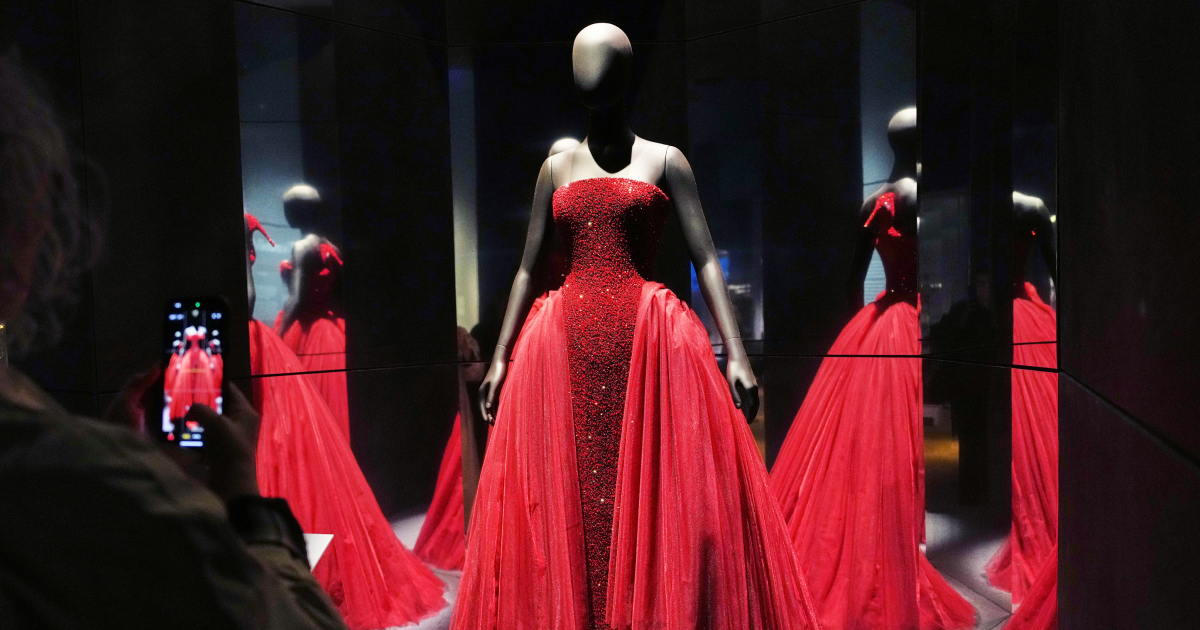 One of the most eye-catching displays is a red jewel-encrusted dress worn by Grande to last year’s Oscars for a medley performance from “Wicked.” The sumptuous ball gown features a ruby slipper protruding from the back of the dress in tribute to “The Wizard of Oz.”