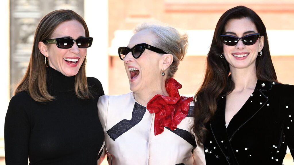(L-R) Caleb Hearon, Simone Ashley, Blunt, Streep, Hathaway and Stanley Tucci