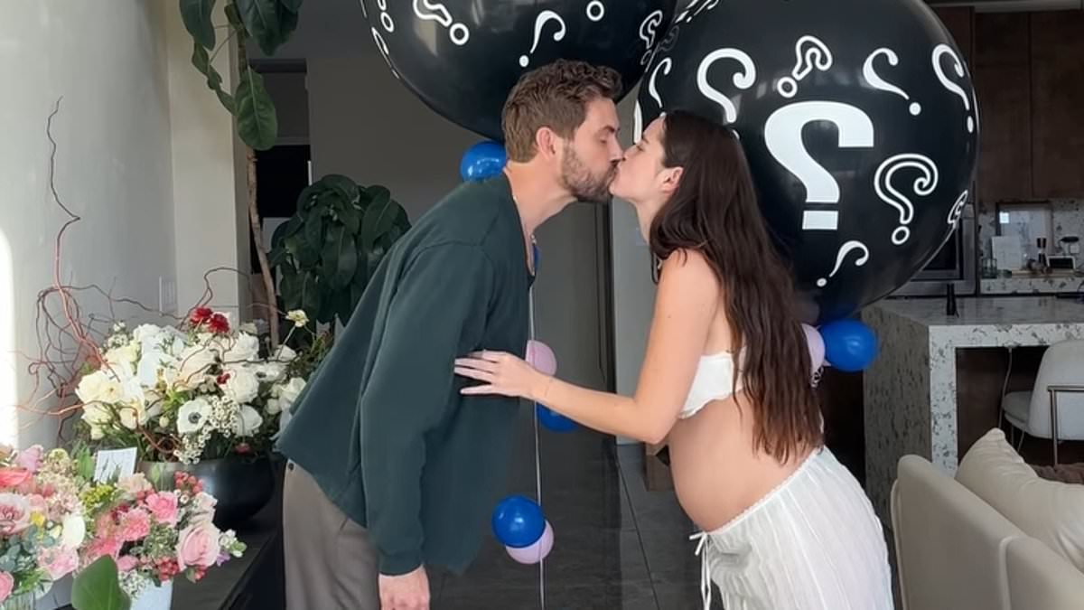 The couple posted a joint Instagram post showing their gender reveal, which saw them share a kiss before Viall, 45, popped two massive balloons that unleashed an explosion of pink.