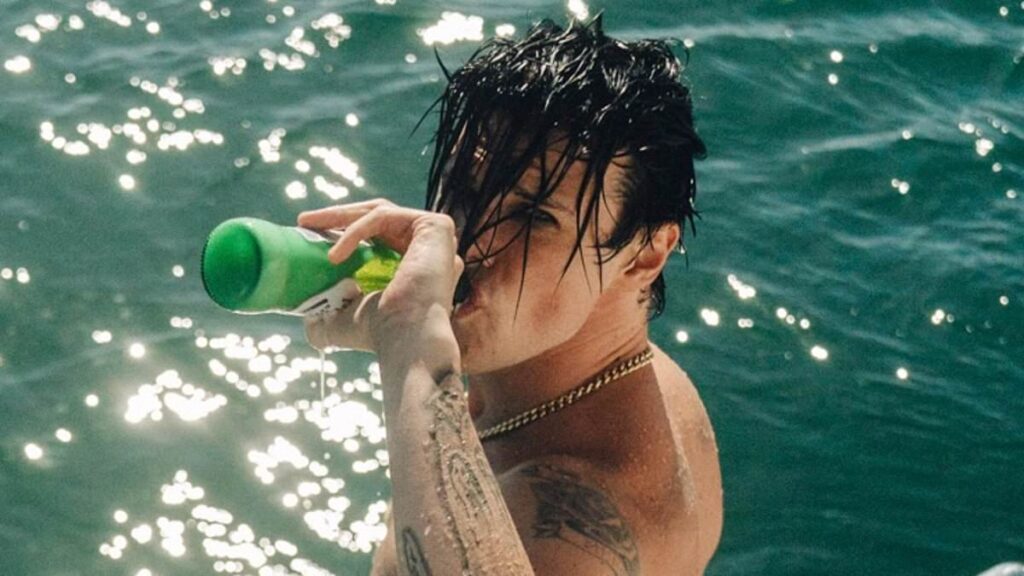 Spotted on the yacht, Yungblud’s tattooed physique was on full display as he strutted about and laughed with his pals, while covering his modesty with one hand.