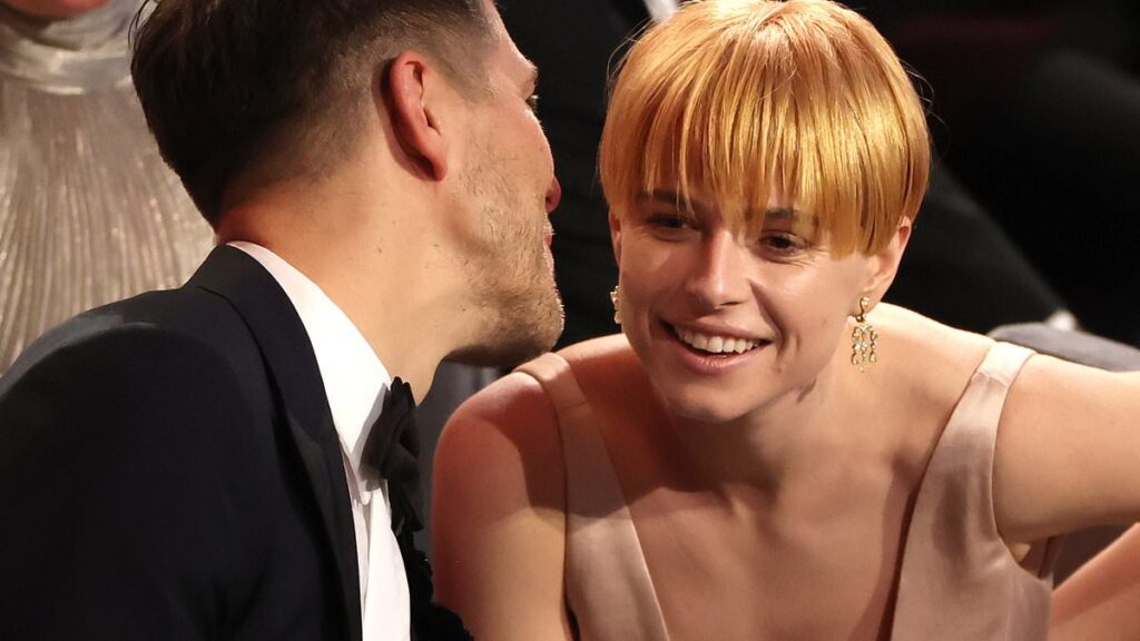 Oscar-nominated actress Jessie Buckley’s husband is a former X Factor producer who worked alongside Simon Cowell, The Daily Mail can reveal (pictured 2022)