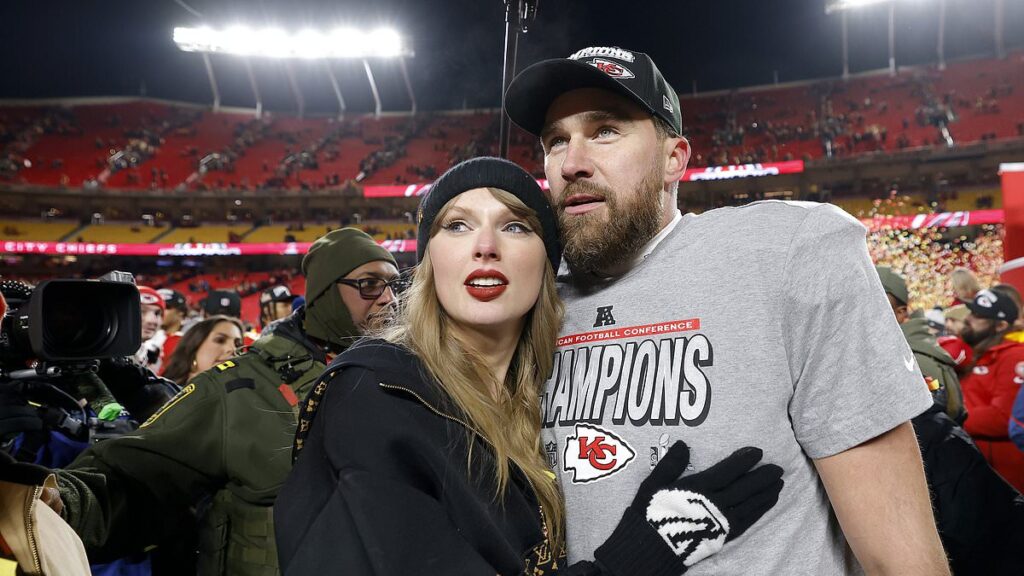 Swift and Kelce pictured celebrating the Chiefs’ AFC Championship win against the Baltimore Ravens on January 28, 2024