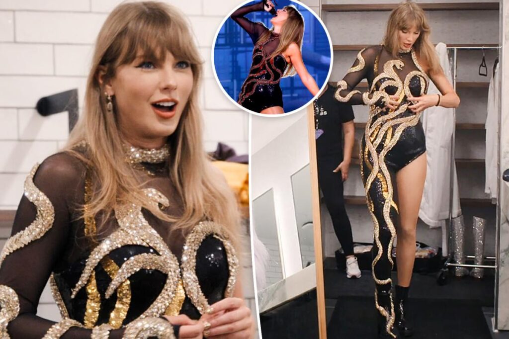 In Episode 3, Swift is shown trying on an early version of the new design, immediately clocking issues with the fit. “It’s just really annoying and I have to do athletic s–t in this,” she comments, gesturing to the placement of the cups in the bust area that made the suit impractical for stage performance.