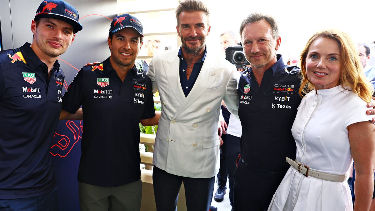 Geri ‘thought of herself as the First Lady of F1. She loved that world and likes to think she’s centre stage of it’ (pictured with Max Verstappen, Sergio Perez and David Beckham in 2022)